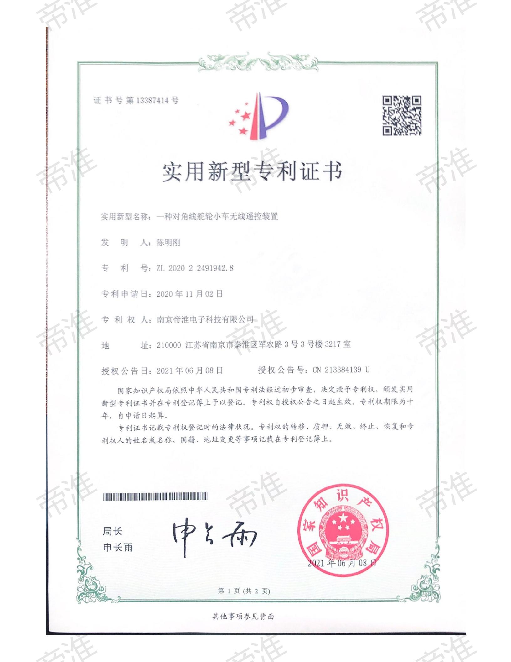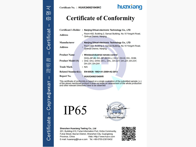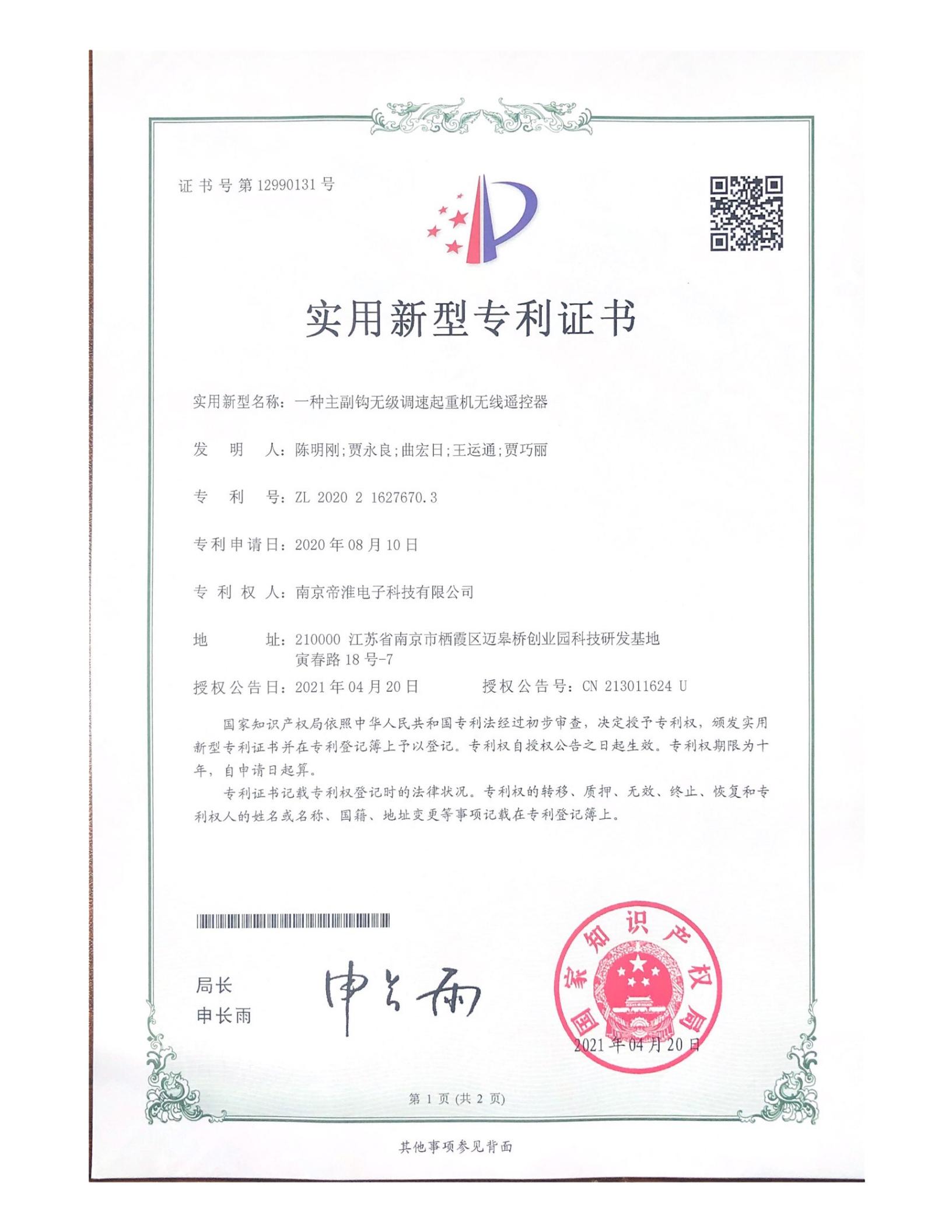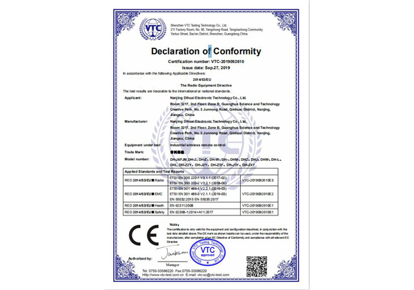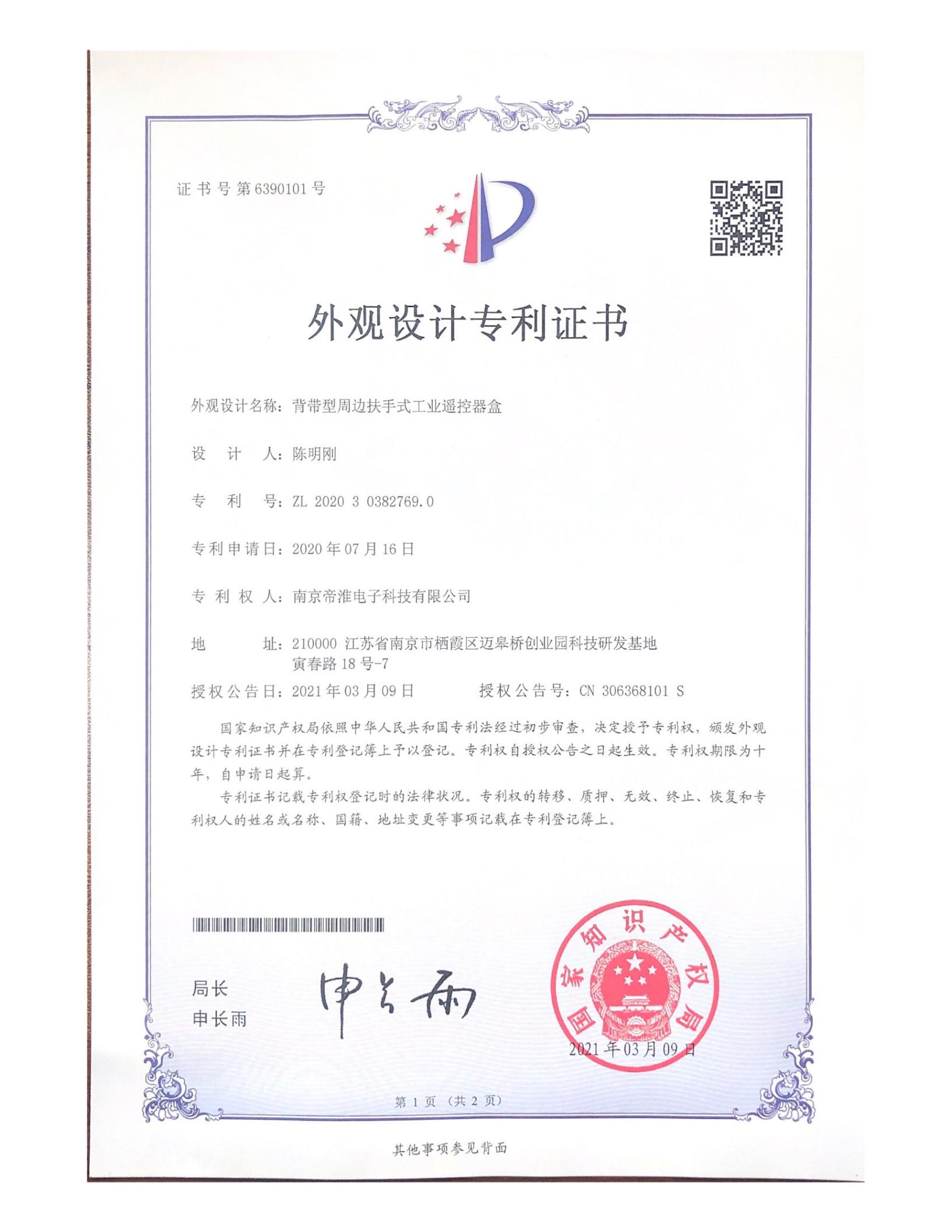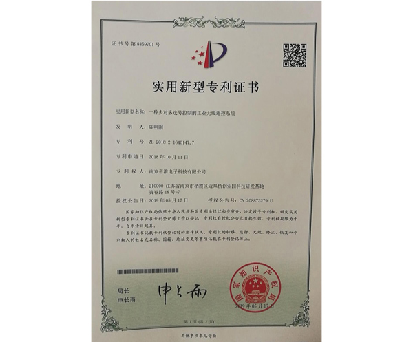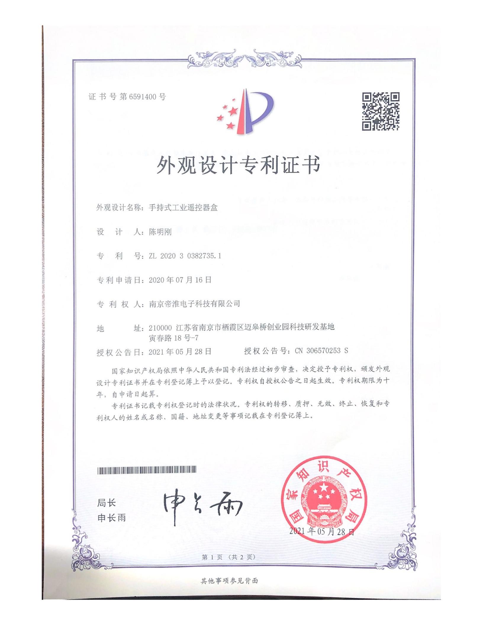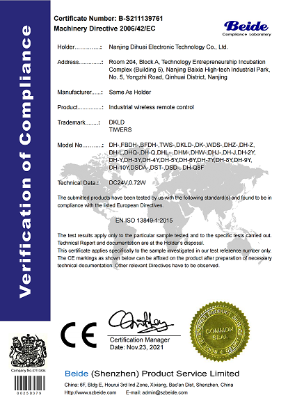 南京帝淮电子科技有限公司,国内工业遥控器行业领军企业,自主研发、定制、非标设计各类工业级无线??仄?、工业级有线控制器、智能化自主算法逻辑的本地控制器等系列产品。已经申请及正在申请的技术专利、外观专利有近三十项左右,并通过了CE欧盟认证、国家级试验检验报告、EMC电磁兼容认证等。